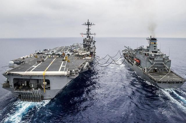 事情大概发生在去年8月的某个南海区域。据当时的情况来看,林肯号及其编队正穿越南海,计划前往印度洋进行进一步的军事部署。而在视频中,我们清楚地看到林肯号航母正在进行补给作业,旁边并排的是一艘补给舰。