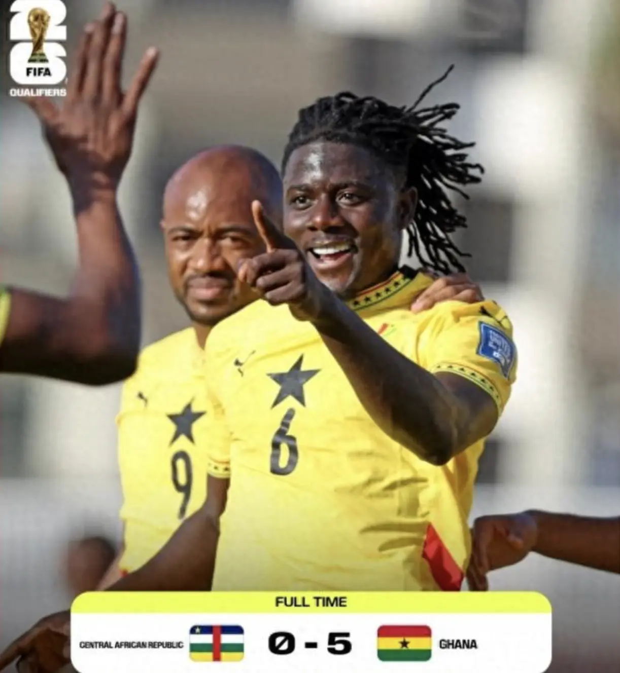 在埃及队晋级世界杯的这一比赛日中,非洲传统强队加纳以5-0的比分大胜中非。加纳队拥有托马斯、库杜斯、乔丹阿尤、塞门约等知名球员,世界排名第75位(国足第94),中非队则位列第140位,阵中身价最高的球员是150万欧元的马福塔,他们与加纳队的实力差距比较大。