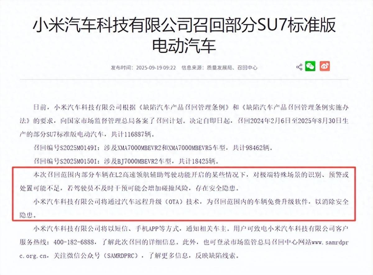 9月19日,小米汽车科技有限公司向国家市场监督管理总局备案召回计划闻喜策略,宣布对116,887辆SU7标准版电动汽车实施远程升级(OTA)召回,涵盖2024年2月6日至2025年8月30日期间生产的部分车型。这一数字约占该车型累计交付量的三成,也是小米汽车成立以来规模最大的一次召回行动。